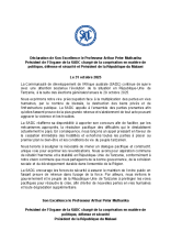 Déclaration de Son Excellence le Professeur Arthur Peter Mutharika Président de l’Organe de la SADC chargé de la coopération en matière de politique, défense et sécurité et Président de la République du Malawi