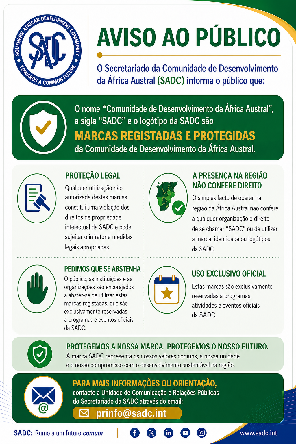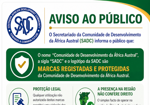 The Secretariat of the Southern African Development Community (SADC) informs the public that the name "Southern African Development Community," the acronym "SADC," and the SADC logo are registered and protected trademarks of the Southern African Development Community. Unauthorised use of these trademarks constitutes an infringement of SADC’s intellectual property rights. The mere fact of operating within the Southern African region does not grant any organisation the right to name itself "SADC" or use the SADC brand and trademarks. We kindly urge the public to refrain from using these registered trademarks as they are exclusively reserved for official SADC programmes and events.